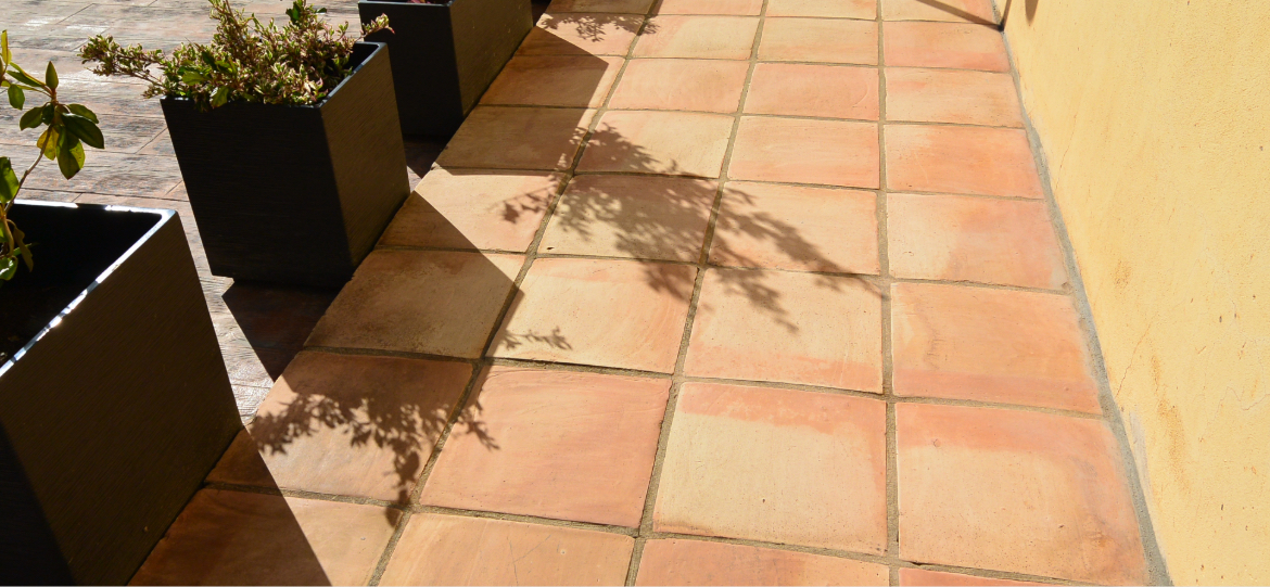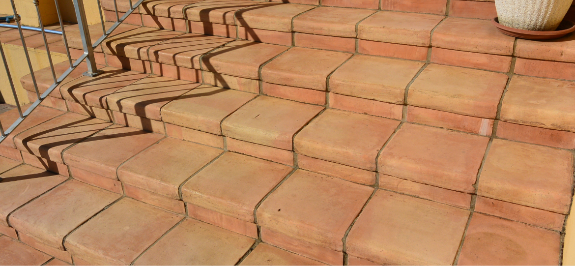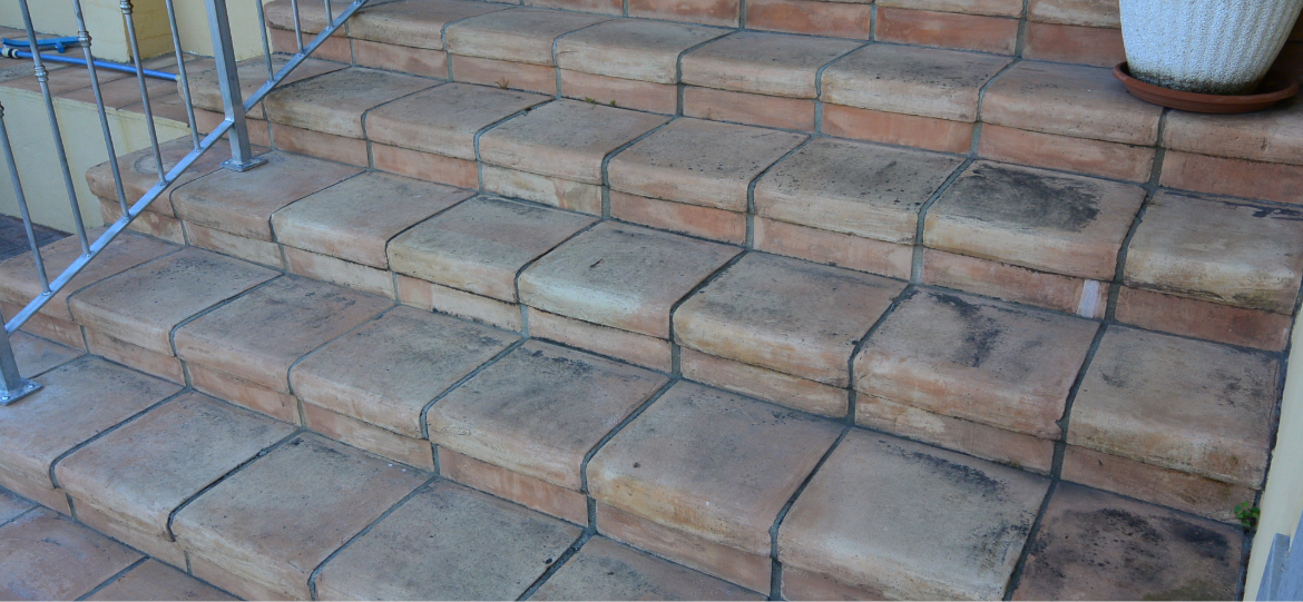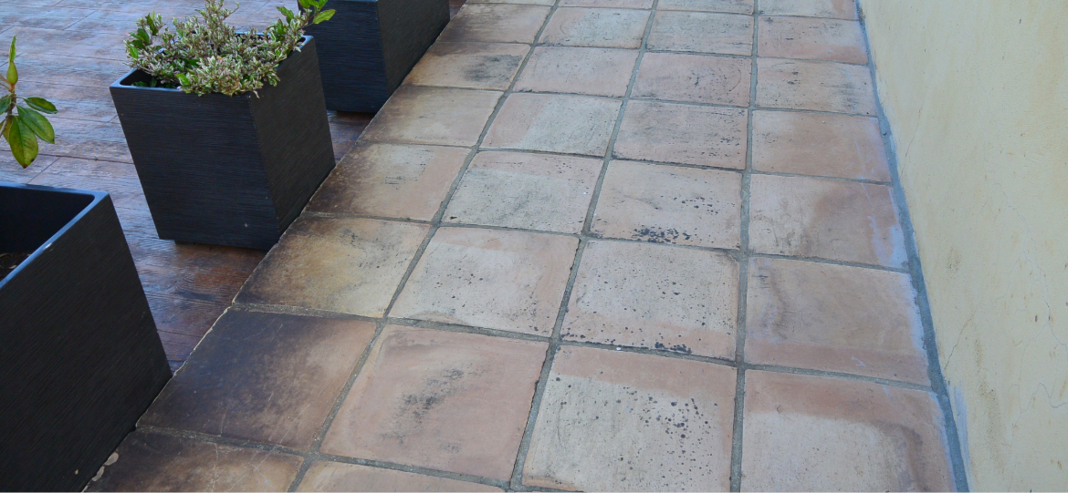 Recuperación del aspecto natural de un pavimento de barro afectado por suciedad, verdín y manchas de humedad