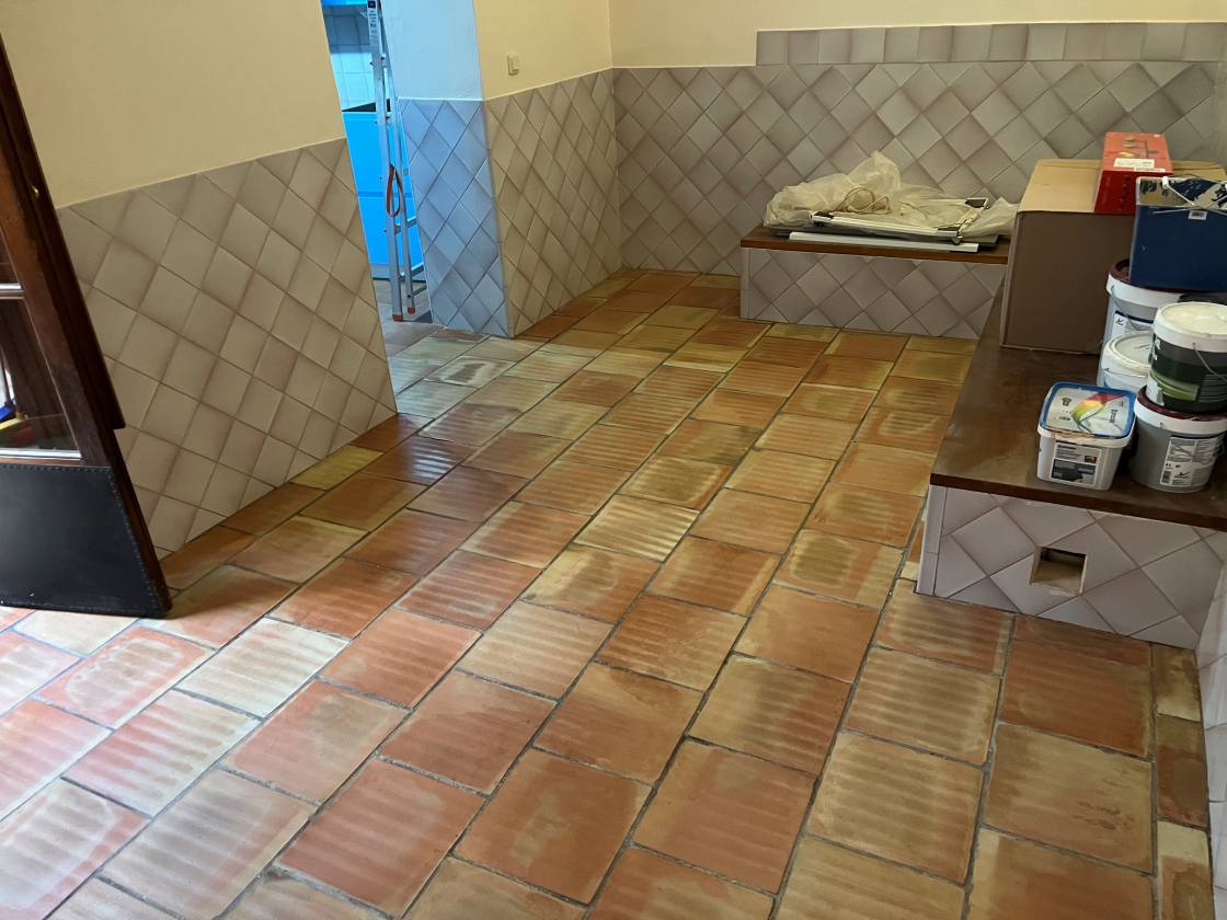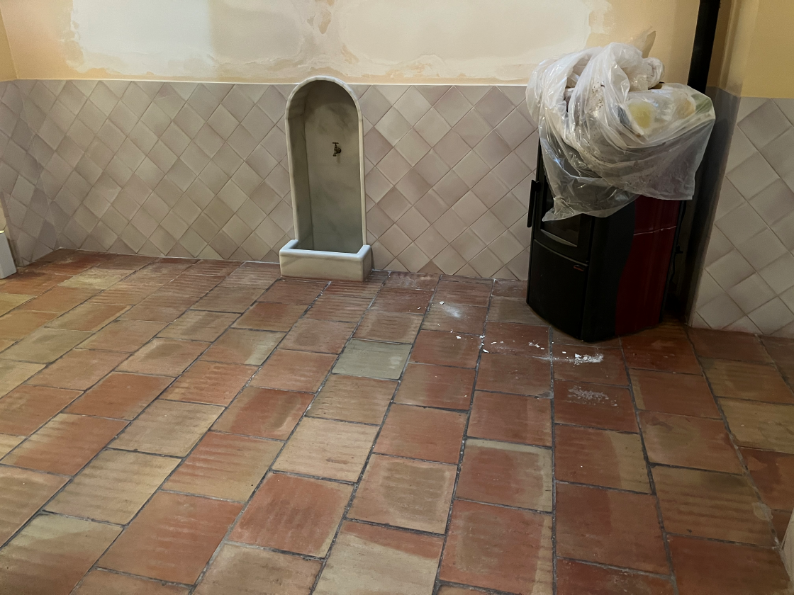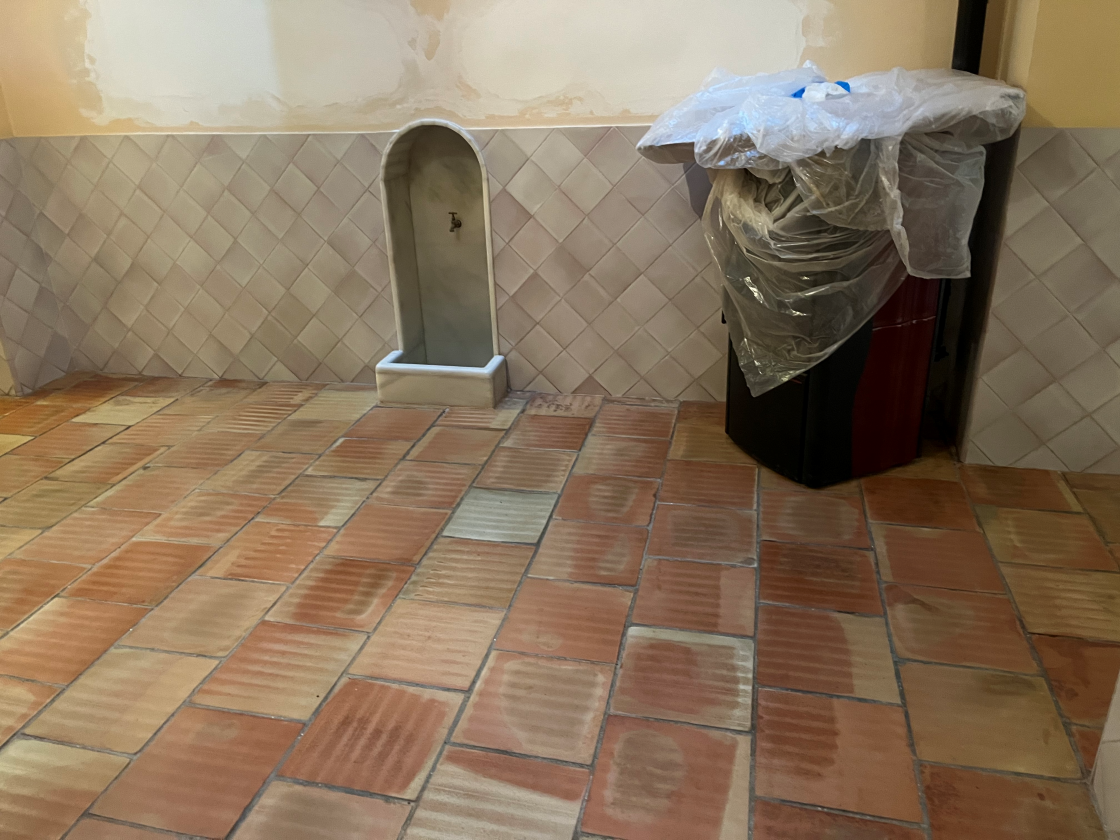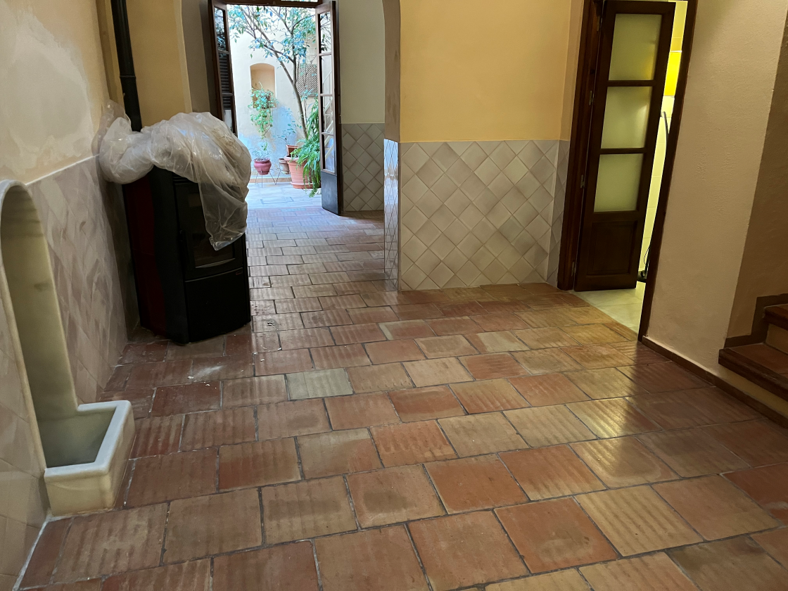 Como acabado final, se aplicó la cera Hidrofab Matt, una cera de acabado mate que aporta una textura suave y natural, reforzando la protección del suelo sin alterar su tono original. El resultado fue un suelo de barro renovado, con un aspecto natural, protegido adecuadamente y acorde con la estética buscada por el propietario.