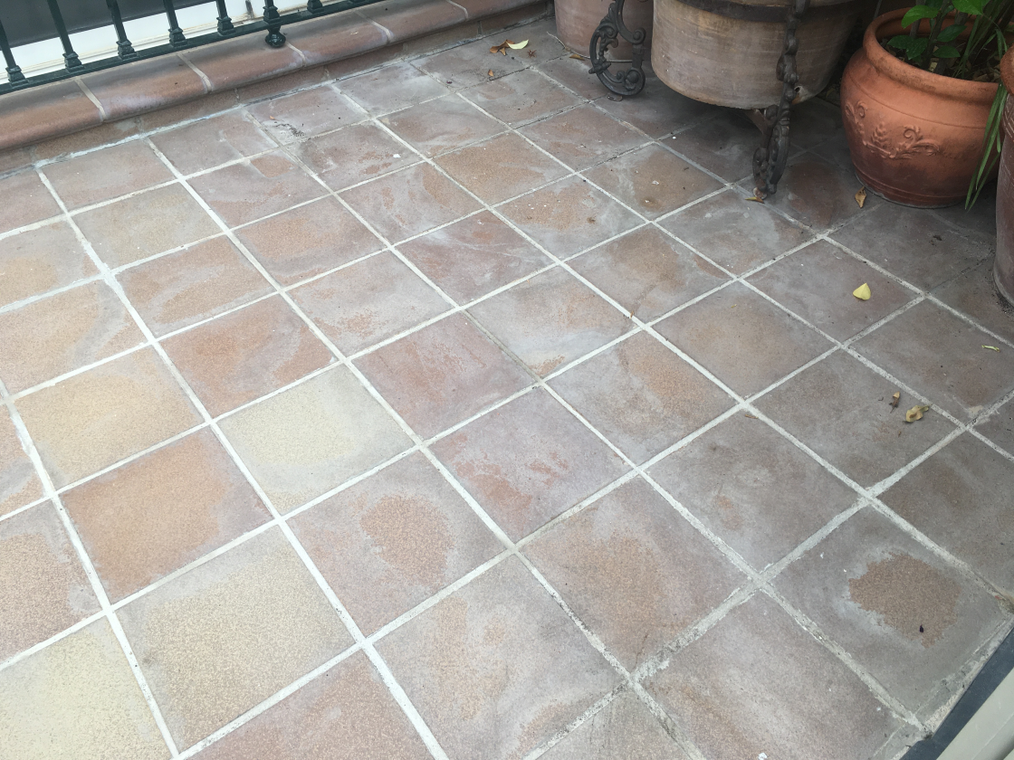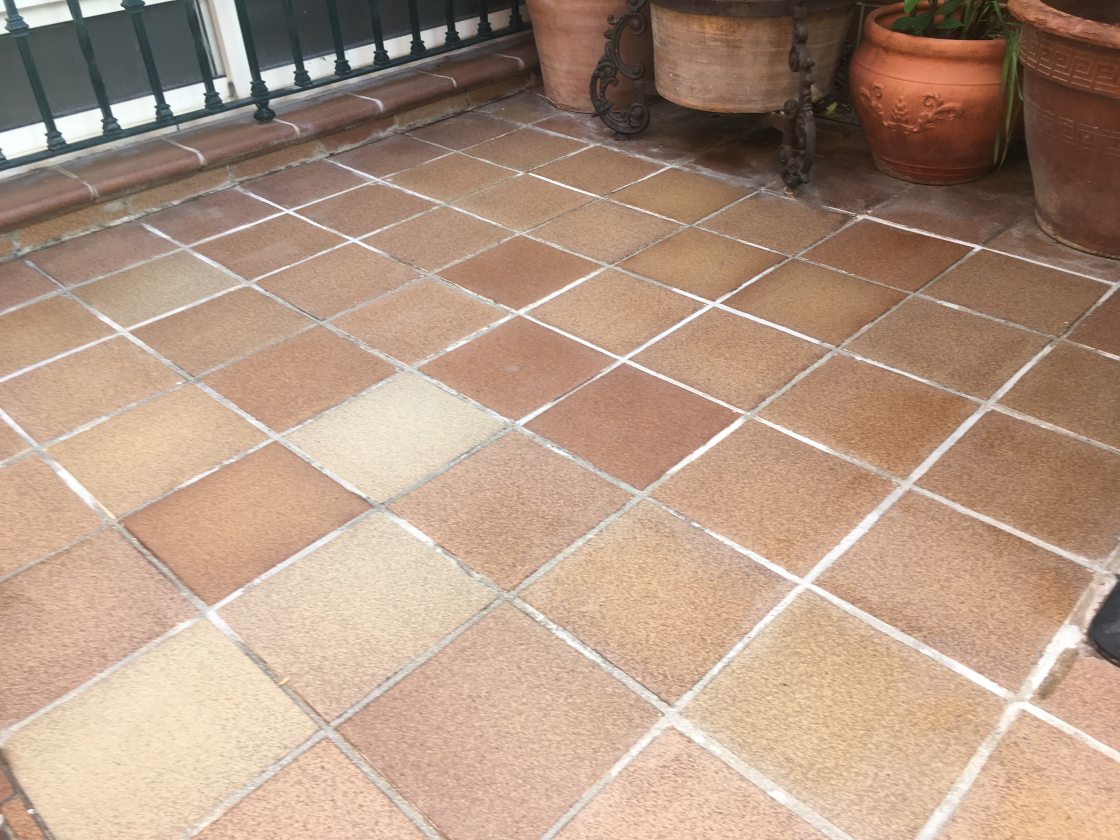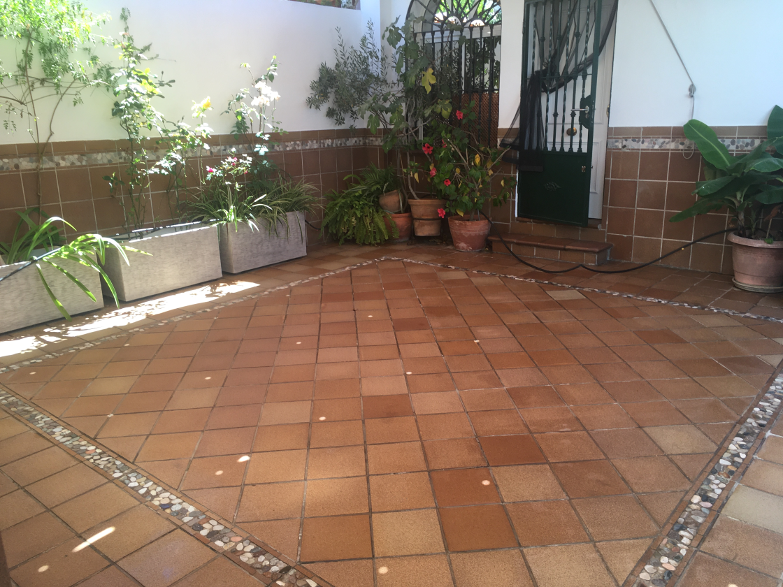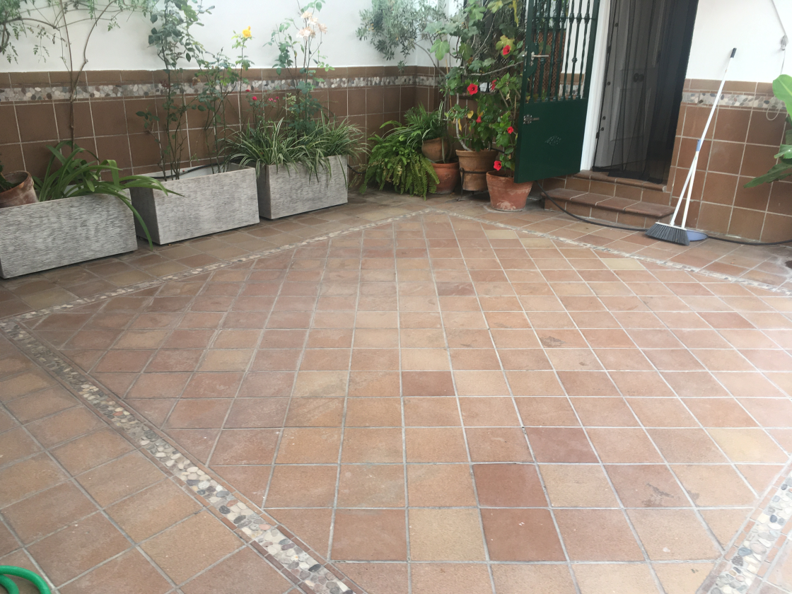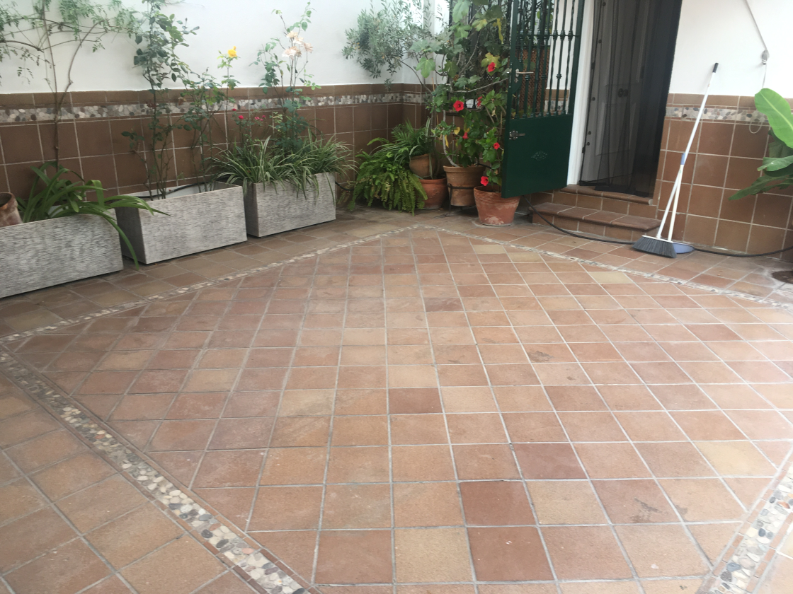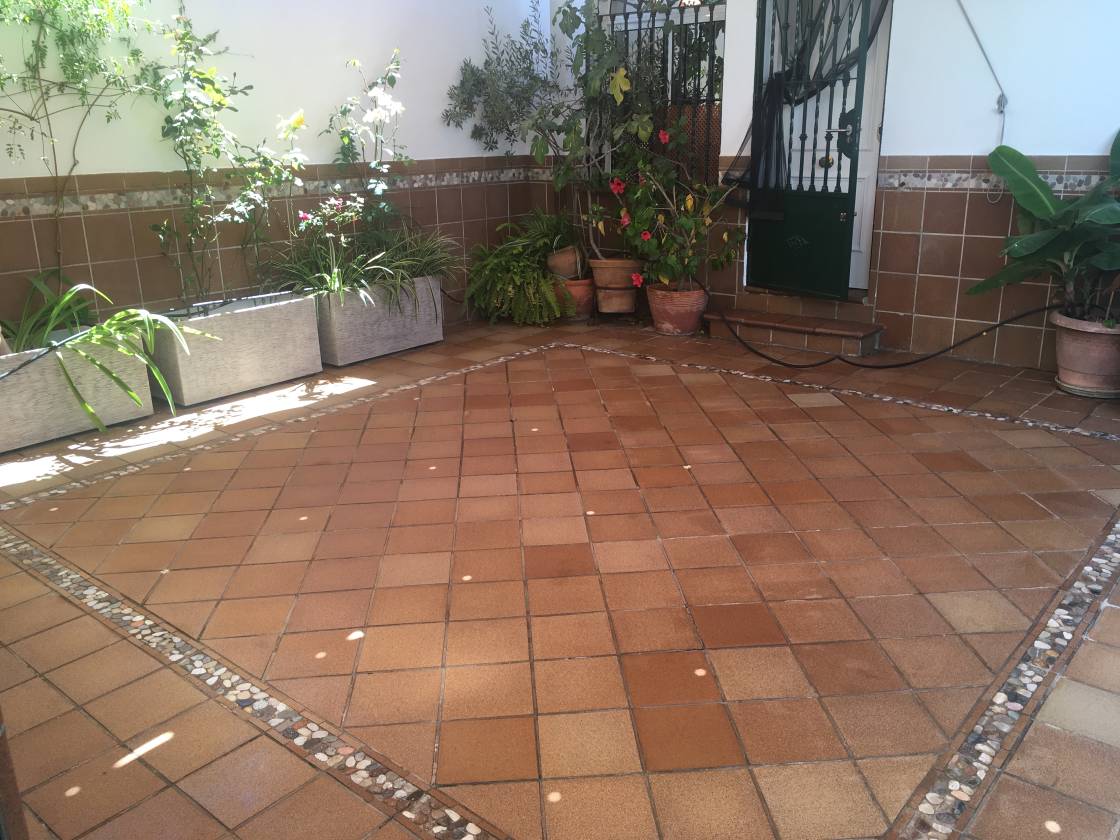 Este trabajo fue realizado en un adosado en Condequinto, Sevilla, sobre un suelo de gres extrusionado en exterior. El pavimento se encontraba rodeado de macetas y diferentes plantas que, al ser regadas de forma habitual, provocaban el goteo constante de agua sobre el suelo. Con el paso del tiempo, esta situación generó marcas de humedad, residuos calcáreos y una pérdida progresiva del color original de las piezas, afectando notablemente a la estética general del pavimento.