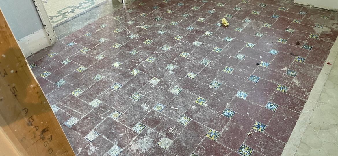 El suelo hidráulico de esta vivienda en calle Xavita (Valencia) presentaba restos de pegamento de alfombras, ataque ácido y suciedad incrustada, lo que afectaba su color, textura y mantenimiento.