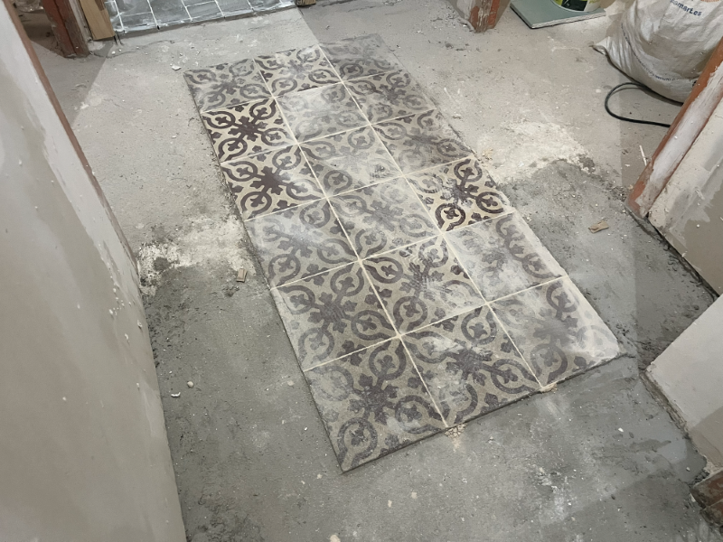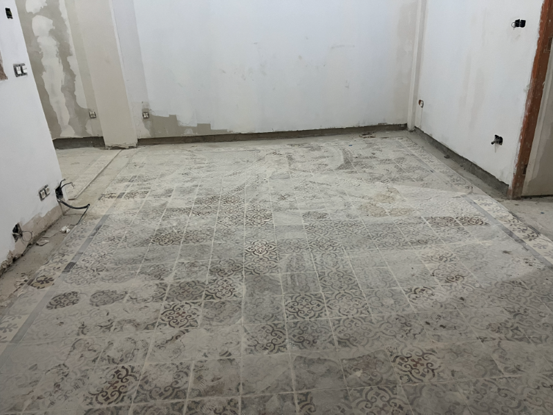 El suelo presentaba un importante desgaste provocado por el paso del tiempo, además de residuos propios de la obra, restos de cemento, perlita y suciedad general que ocultaban completamente el dibujo y el tono original de las baldosas hidráulicas.