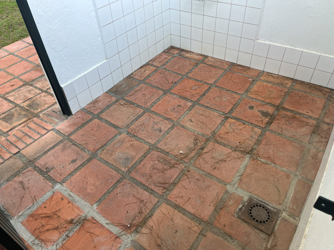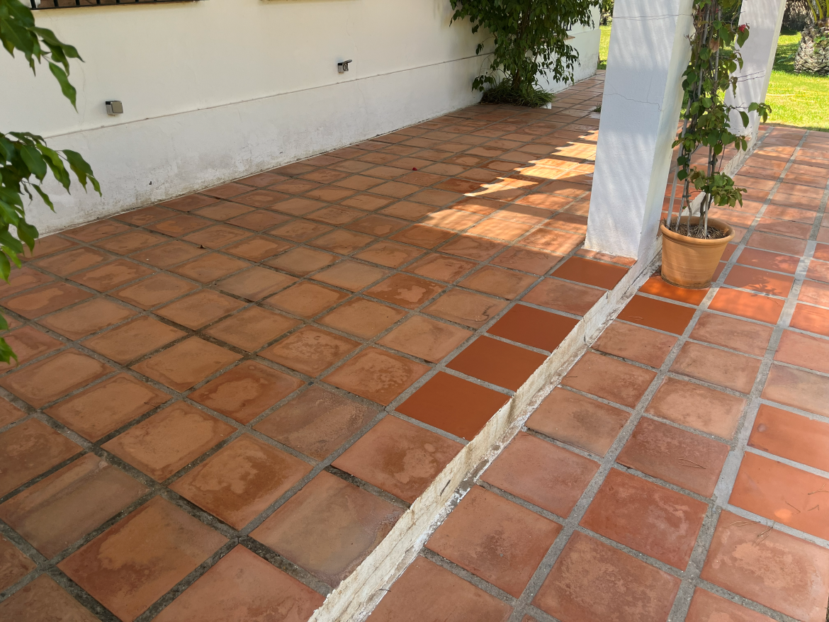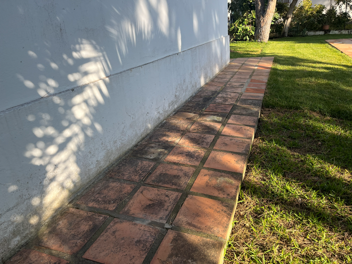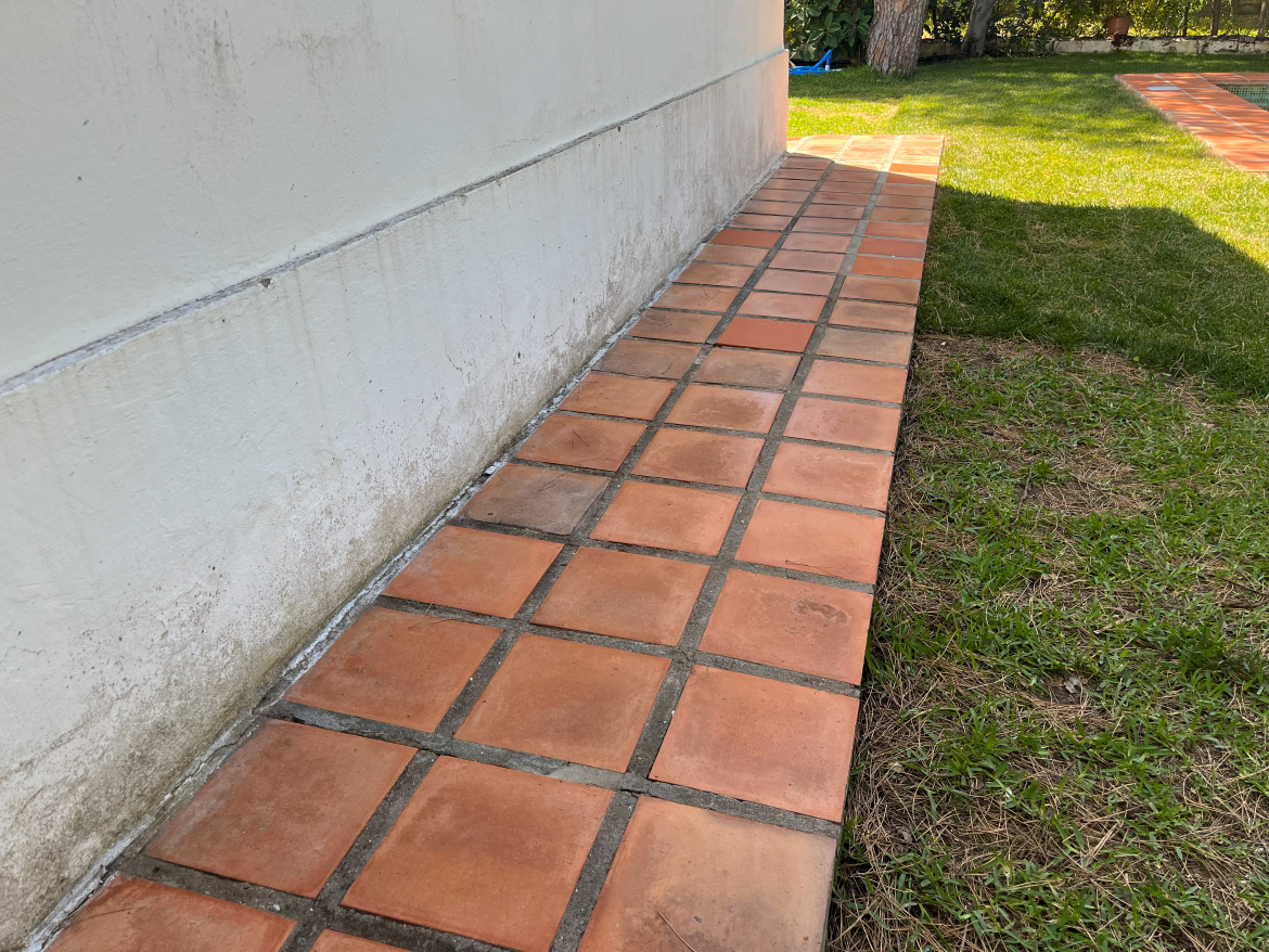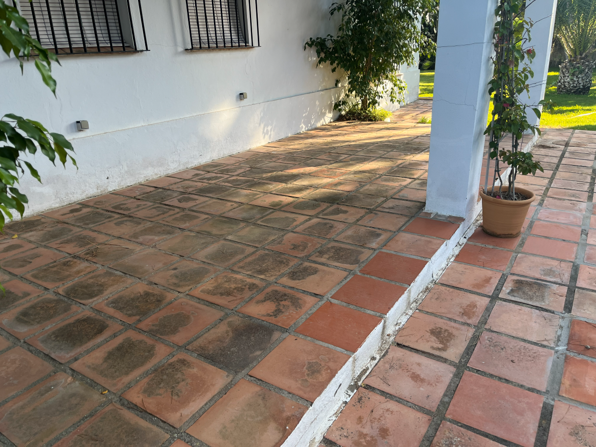 En el exterior, el suelo de barro presentaba una fuerte acumulación de verdín y residuos calcáreos provocados por la humedad y la exposición a la intemperie. Para la limpieza en profundidad se utilizó Cement Remover eliminando eficazmente la suciedad incrustada y devolviendo la limpieza al pavimento.