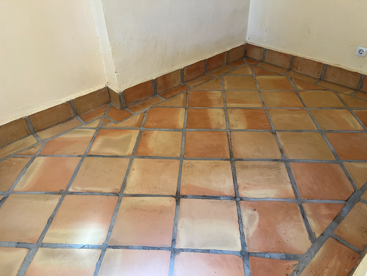 En el interior, el suelo presentaba un tratamiento antiguo a base de barniz, muy deteriorado y endurecido con el paso del tiempo, que alteraba el aspecto original del barro y dificultaba su mantenimiento. Debido a la intensidad y dureza del tratamiento existente, fue necesario aplicar una combinacion del Deep Degreaser y Solvent Stripper, logrando eliminar por completo el barniz y los residuos acumulados en la superficie.